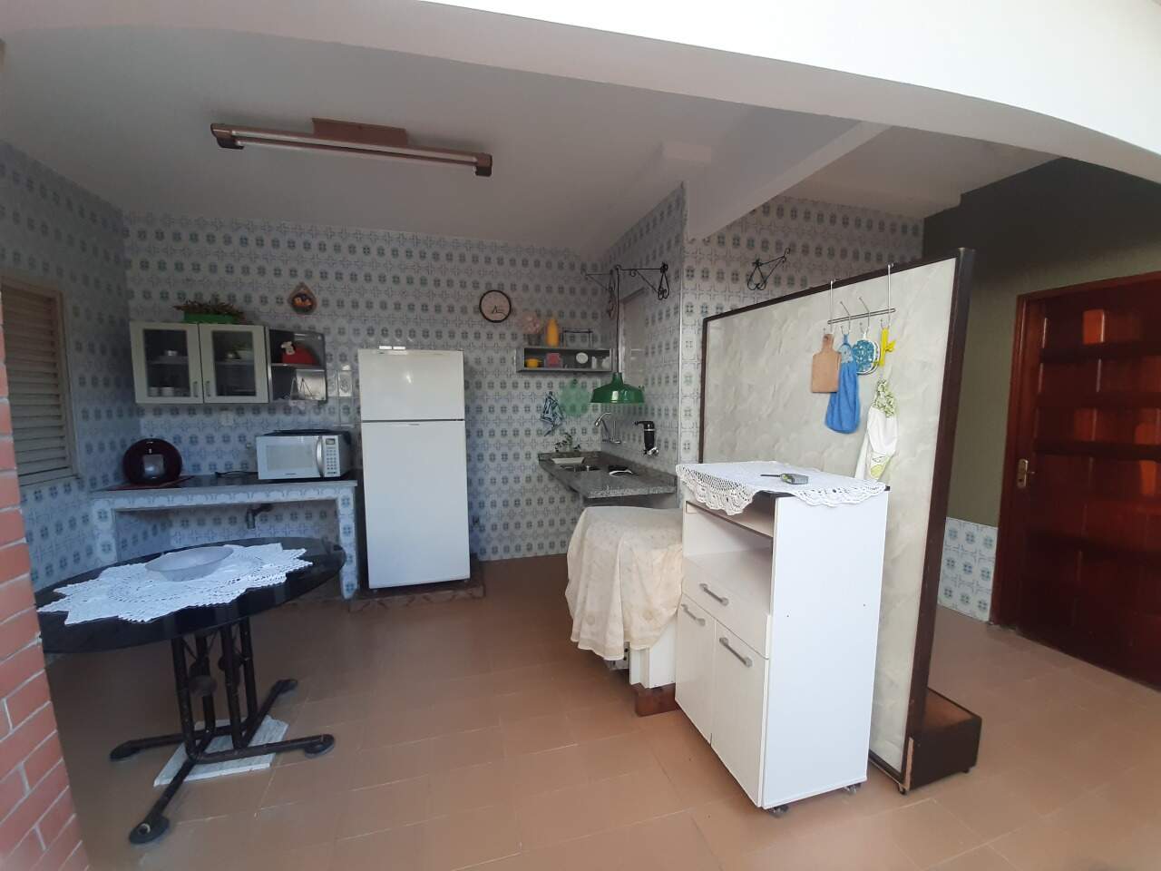 COZINHA COM MESA, CADEIRAS, GELADEIRA, FOGÃO, MICROONDAS, CAFETEIRA, LIQUIDIFICADOR